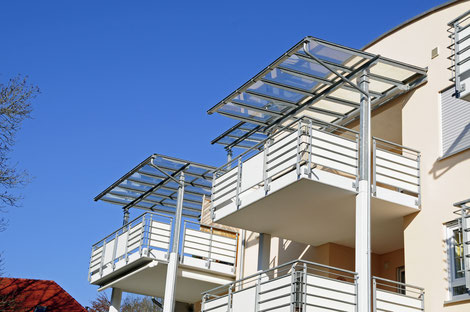 Schöne Aussicht haben Sie von unseren Balkonen, die sich elegant in das Gesamtbild des Hauses einfügen. Die Vielzahl an Gestaltungsmöglichkeiten wird abgerundet durch den Einsatz von Dekorblenden aus Vollkern - Kunststoffplatten, einem Licht- und witterungsbeständigem Material. Ein elegantes Geländer wirkt ganz entscheidend für das Erscheinungsbild eines Balkons. Unsere Geländer aus reinem Edelstahl oder Stahl lackiert, liefern wir mit geschmackvoll gestalteten Füllungen - je nach Design - aus Edelstahl.